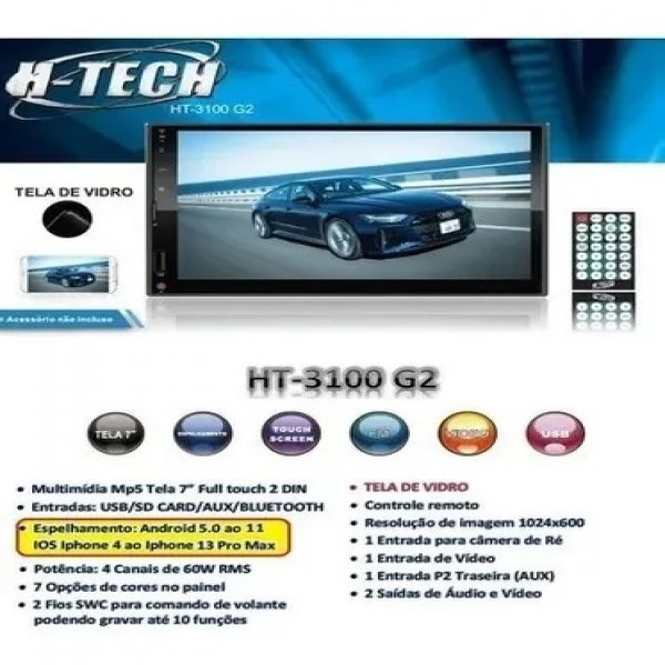 MP5 MULTIMIDIA HT3100G2 7 POLEGADAS BLUETOOTH H TECH TELA DE VIDRO