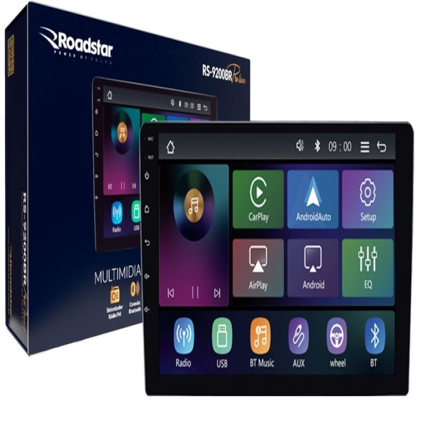 MULTIMIDIA ROADSTAR RS9200BR PRO LINE 9 POLEGADAS CARPLAY ANDROID AUTO ESPELHAMENTO SEM FIO MIRROLINK CABO USB PENDRIVE ATE32GB